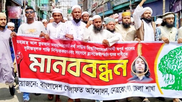 পবিত্র কোরআন অবমাননার প্রতিবাদে নেত্রকোনায় মানববন্ধন ও বিক্ষোভ সমাবেশ।