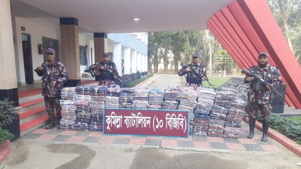কুমিল্লায় বিজিবির অভিযানে ৮৮ লাখ টাকার অবৈধ ভারতীয় শাড়ির বিশাল চালান জব্দ।
