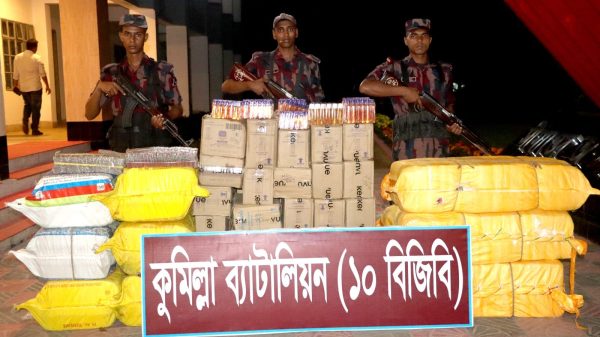 কুমিল্লায় ১০ বিজিবি’র বড় সাফল্য: প্রায় ৪৮ লক্ষ টাকার ভারতীয় বাজি ও কসমেটিক্স জব্দ