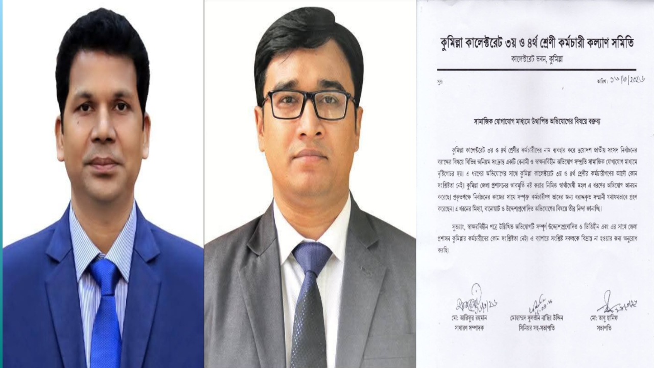 কুমিল্লা জেলা প্রশাসক কার্যালয়ের ৩য় ও ৪র্থ শ্রেণির কর্মচারীদের নামে জেলা প্রশাসক ও অতিরিক্ত জেলা প্রশাসকের বিরুদ্ধে সামাজিক যোগাযোগমাধ্যমে ছড়িয়ে পড়া স্বাক্ষরবিহীন একটি চিঠিকে উদ্দেশ্যপ্রণোদিত ও ভিত্তিহীন বলে দাবি করেছে কালেক্টরেট কর্মচারী কল্যাণ সমিতি।
