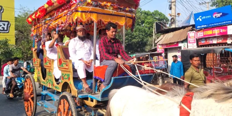 সোমবার (০৬ এপ্রিল) সকালে কলেজের প্রিয় অধ্যক্ষ প্রফেসর খন্দকার মো. হুমায়ুন রেজা কবীরকে অবসরজনিত বিদায় জানাতে গিয়ে এক ব্যতিক্রমী ও হৃদয়স্পর্শী আয়োজন করে শিক্ষক-শিক্ষার্থীরা। প্রথাগত বিদায় নয়, বরং ঘোড়ার গাড়িতে চড়িয়ে রাজকীয় সম্মানে তাঁকে পৌঁছে দেওয়া হলো তাঁর নিজ বাসভবনে।