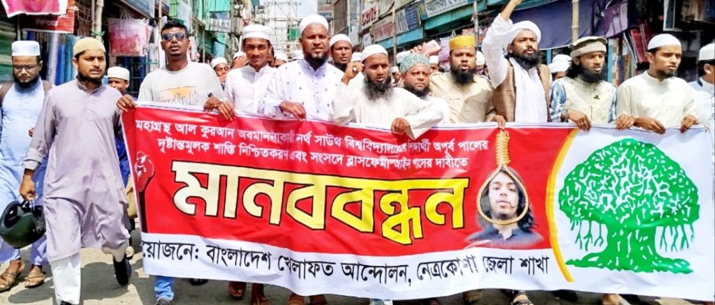 নর্থ সাউথ ইউনিভার্সিটির হিন্দু ছাত্র অপূর্ব পাল কর্তৃক ধর্ম নিয়ে কটুক্তি এবং পবিত্র কোরআন অবমাননার প্রতিবাদে নেত্রকোণায় মানববন্ধন ও বিক্ষোভ সমাবেশ অনুষ্ঠিত হয়েছে।