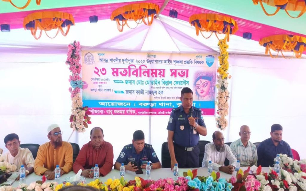 সভায় প্রধান অতিথি হিসেবে উপস্থিত ছিলেন কুমিল্লা সদর দক্ষিণ সার্কেলের সিনিয়র সহকারী পুলিশ সুপার মোঃ মোস্তাইন বিল্লাল ফেরদৌস। সভাপতিত্ব করেন বরুড়া থানার অফিসার ইনচার্জ (ওসি) কাজী নাজমুল হক। সভায় পূজামণ্ডপে শতভাগ সিসি ক্যামেরা স্থাপন, স্বেচ্ছাসেবকদের জন্য আইডি কার্ড বাধ্যতামূলক করা, বিদ্যুতের বিকল্প জেনারেটর রাখা এবং রাত ৮টার মধ্যে বিসর্জন সম্পন্ন করার মতো কয়েকটি গুরুত্বপূর্ণ নির্দেশনা দেওয়া হয়। এছাড়া মন্দিরের আশপাশে মসজিদ থাকলে নামাজের সময় মাইক ব্যবহার থেকে বিরত থাকারও পরামর্শ দেওয়া হয়।সভায় জাতীয়তাবাদী দলের সাধারণ সম্পাদক সৈয়দ জহিরুল হক স্বপন জানান, পূজামণ্ডপগুলোতে বিশেষ মনিটরিংয়ের ব্যবস্থা নেওয়া হয়েছে। জামায়াতে ইসলামের আমীর মোঃ সাহাদাত হোসেন, সাংবাদিক ইউনিয়ন পরিষদ কুমিল্লার সভাপতি সাংবাদিক দিলীপ মজুমদার, পূজা উদযাপন কমিটির নেতৃবৃন্দ ও হিন্দু-বৌদ্ধ-খ্রিস্টান পরিষদের প্রতিনিধিরাও বক্তৃতা দেন। তারা সবাই মিলেমিশে উৎসবকে শান্তিপূর্ণভাবে সম্পন্ন করার আহ্বান জানান। প্রতিবারের মতো এবারও বরুড়ার পূজা মণ্ডপগুলোতে শুধু হিন্দু সম্প্রদায় নয়, সব ধর্ম-বর্ণের মানুষ ভিড় জমাবেন। পূজা উদযাপন কমিটি ও প্রশাসনের সক্রিয় সহযোগিতায় স্থানীয়রা আশাবাদী— এ বছরও দুর্গাপূজা হবে আনন্দমুখর, শান্তিপূর্ণ ও সম্প্রীতির এক অনন্য দৃষ্টান্ত।