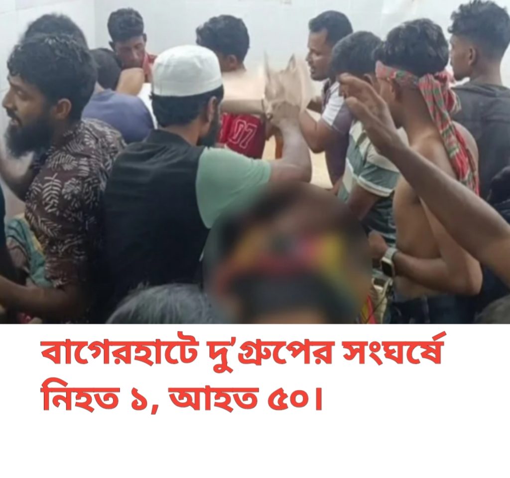 আধিপত্য বিস্তারকে কেন্দ্র করে বাগেরহাটের মোল্লাহাটে দু’গ্রুপের সংঘর্ষে একজন নিহত হয়েছেন। এ সময় আহত হয়েছে নারীসহ কমপক্ষে ৫০ জন। শনিবার (৭জুন) সন্ধ্যায় উপজেলার সিংগাতি গ্রামে এ ঘটনা ঘটে। আহতদের উদ্ধার করে গোপালগঞ্জ ২৫০ শয্যাহাসপাতালে ভর্তি করা হয়েছে। এ সময় কর্তব্যরত চিকিৎসক আজিজুর রহমান চৌধুরী (৩০) নামে এক যুবককে মৃত ঘোষণা করে।