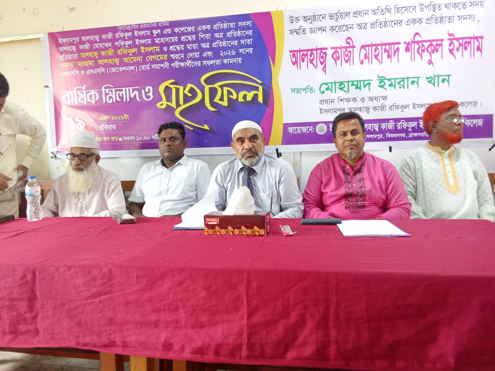 ব্রাহ্মণবাড়িয়ার বিজয়নগর উপজেলার ইসলামপুরে অবস্থিত আলহাজ্ব কাজী রফিকুল ইসলাম স্কুল অ্যান্ড কলেজে এক দোয়া ও মিলাদ মাহফিল অনুষ্ঠিত হয়েছে। রবিবার (১৯ এপ্রিল ২০২৬) প্রতিষ্ঠানের প্রতিষ্ঠাতা আলহাজ্ব কাজী শফিকুল ইসলামের পরম শ্রদ্ধেয় প্রয়াত পিতা মরহুম আলহাজ্ব কাজী রফিকুল ইসলাম ও মাতা মরহুমা আলহাজ্ব আমেনা বেগমের বিদেহী আত্মার মাগফিরাত কামনা এবং আসন্ন এসএসসি পরীক্ষার্থীদের বিদায় উপলক্ষ্যে এই অনুষ্ঠানের আয়োজন করা হয়। প্রতিষ্ঠানটির প্রধান শিক্ষক ও অধ্যক্ষ মোহাম্মদ ইমরান খানের সভাপতিত্বে অনুষ্ঠানে প্রধান অতিথি হিসেবে ভার্চুয়ালি যুক্ত ছিলেন বিদ্যালয়ের প্রতিষ্ঠাতা আলহাজ্ব কাজী শফিকুল ইসলাম। প্রধান আলোচক হিসেবে উপস্থিত থেকে গুরুত্বপূর্ণ বক্তব্য রাখেন আলহাজ্ব কাজী শফিকুল ইসলাম বিশ্ববিদ্যালয়ের অধ্যক্ষ হাফেজ শফিকুর রহমান। বিদ্যালয়ের শিক্ষক আবদুল কুদ্দুছের প্রাণবন্ত সঞ্চালনায় অনুষ্ঠানে বিশেষ অতিথি হিসেবে বক্তব্য রাখেন অত্র বিদ্যালয়ের এডহক কমিটির অভিভাবক সদস্য মুন্সি আসাদুজ্জামান আসাদ। এছাড়াও বক্তব্য রাখেন, মানবিক টিমের নিয়াজ উদ্দিন, আবু ইউসুফ সাদ্দাম, কাজী মনিরুল ইসলাম, বিজয়নগর প্রেসক্লাবের সাধারণ সম্পাদক আবদুল্লাহ আল হৃদয় এবং জিয়াদুল হক বাবু। অনুষ্ঠানটির সার্বিক পরিচালনায় ছিলেন অত্র বিদ্যালয়ের সহ-প্রধান শিক্ষক মনির হোসেন ও শিক্ষিকা ছবি আক্তার। পবিত্র কোরআন থেকে তেলাওয়াতের মাধ্যমে অনুষ্ঠানের সূচনা করা হয়। প্রধান অতিথির বক্তব্যে আলহাজ্ব কাজী শফিকুল ইসলাম পরীক্ষার্থীদের সাফল্য কামনা করে বলেন, "শিক্ষা ও নৈতিকতার সমন্বয়ে নিজেদের গড়ে তুলে দেশের সেবায় আত্মনিয়োগ করতে হবে।" সভাপতির বক্তব্যে অধ্যক্ষ মোহাম্মদ ইমরান খান শিক্ষার্থীদের উজ্জ্বল ভবিষ্যৎ ও প্রতিষ্ঠাতা মহোদয়ের প্রয়াত পিতামাতার আত্মার শান্তি কামনা করেন। পরিশেষে, অত্র বিদ্যালয়ের ধর্মীয় শিক্ষক মাওলানা আবু সালেহ মিলাদ ও বিশেষ মোনাজাত পরিচালনা করেন। দোয়া মাহফিলে মরহুমদের আত্মার মাগফিরাত এবং বিদায়ী শিক্ষার্থীদের পরীক্ষায় সাফল্য ও মঙ্গল কামনায় বিশেষ প্রার্থনা করা হয়। মিলাদ ও দোয়ার মাধ্যমেই অনুষ্ঠানের সমাপ্তি ঘোষণা করা হয়। অনুষ্ঠানে বিদ্যালয়ের শিক্ষক-শিক্ষার্থী, অভিভাবক ও স্থানীয় গণ্যমান্য ব্যক্তিবর্গ উপস্থিত ছিলেন।
