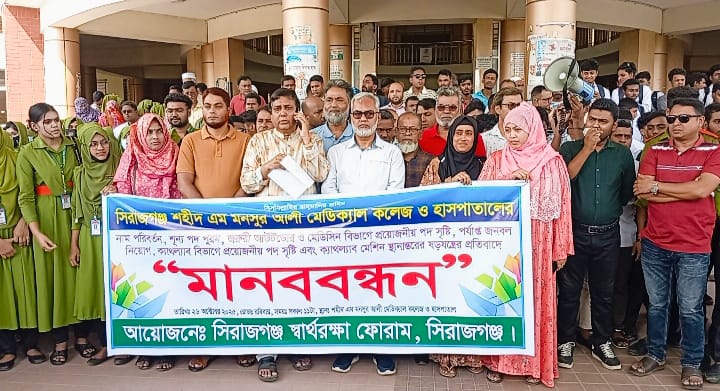 সিরাজগঞ্জের শহীদ এম মনসুর আলী মেডিকেল কলেজ হাসপাতাল থেকে ২০ কোটি টাকা মূল্যের আধুনিক কার্ডিয়া ক্যাথ-ল্যাব মেশিন অন্যত্র সরিয়ে নেওয়ার ষড়যন্ত্রের প্রতিবাদে মানববন্ধন কর্মসূচি পালন করেছে স্থানীয় চিকিৎসক ও নাগরিক সমাজ।