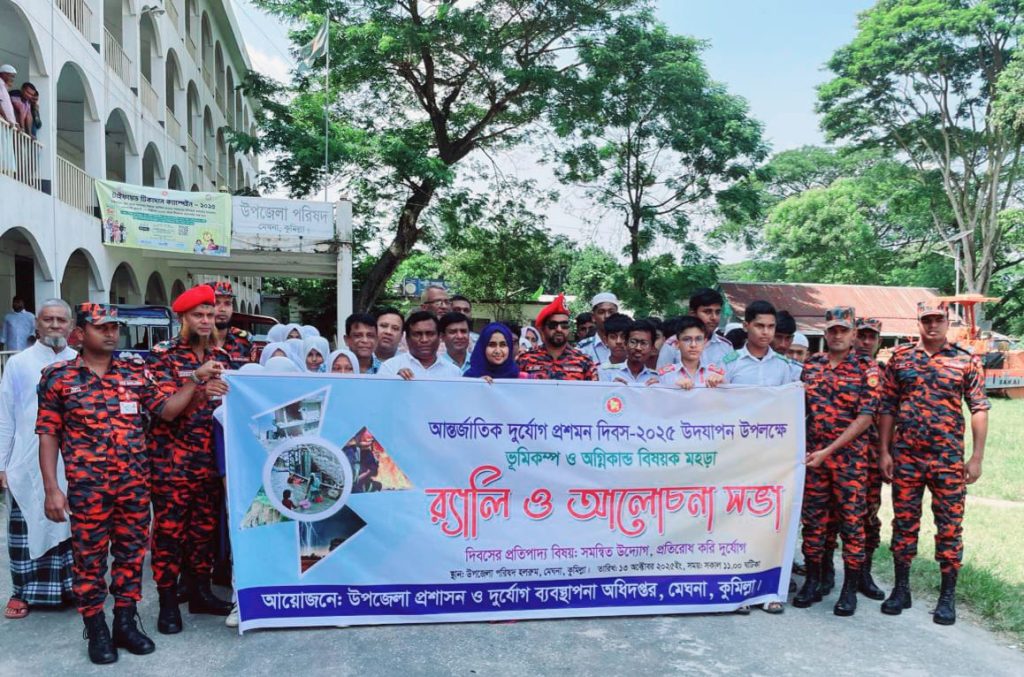 ‘স্মার্ট বাংলাদেশে দুর্যোগ প্রস্তুতি হোক সবার অঙ্গীকার’—এই প্রতিপাদ্যকে সামনে রেখে কুমিল্লার মেঘনা উপজেলায় উদযাপিত হয়েছে আন্তর্জাতিক দুর্যোগ প্রশমন দিবস–২০২৫। সোমবার (১৩ অক্টোবর) সকালে উপজেলা প্রশাসন ও দুর্যোগ ব্যবস্থাপনা অধিদপ্তরের যৌথ উদ্যোগে উপজেলা পরিষদ চত্বরে আয়োজন করা হয় বর্ণাঢ্য র‍্যালি ও আলোচনা সভার।