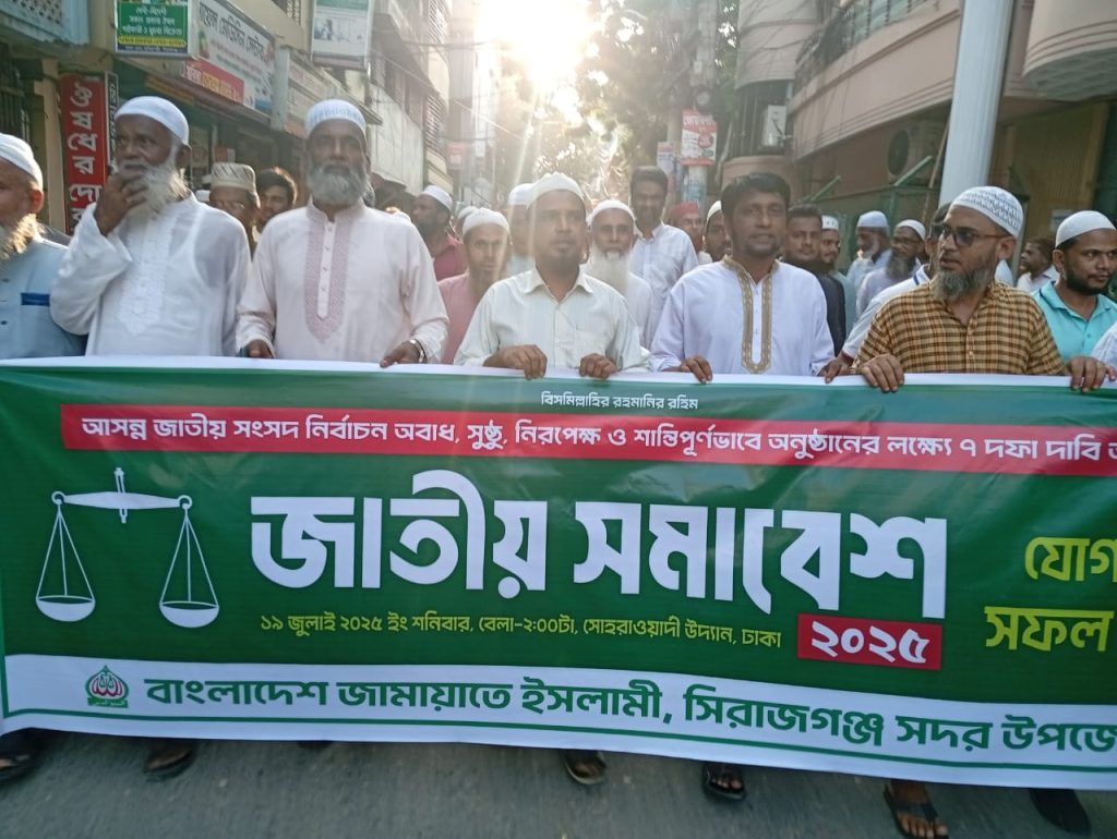 শনিবার (১২ জুলাই ) বিকালে সিরাজগঞ্জ জামায়াতে ইসলামী জেলা শাখার আয়োজনে শহরের দর্গাপুট্টি দলীয় কার্যালয় ও মুক্তা প্লাজার সামনে সড়কে মানববন্ধন ও বিক্ষোভ সমাবেশ অনুষ্ঠিত হয়। সমাবেশ শেষে বিক্ষোভ মিছিল বের করা হয়। মিছিলটি শহরের গুরুত্বপূর্ণ সড়ক চোরাস্তা হয়ে বড় ফুলের সামনে দিয়ে বড় বাজারের মাঝখান দিয়ে প্রদক্ষিণ করে শেষে দর্গাপুট্টি মোড়ে গিয়ে শেষ হয়।