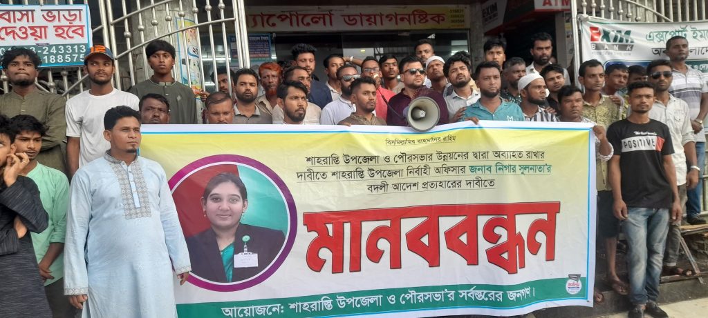 শাহরাস্তি উপজেলা নির্বাহী কর্মকর্তা (ইউএনও) নিগার সুলতানার বদলী স্থগিত করনের দাবীতে মানববন্ধন করেছে শাহরাস্তি উপজেলা বাসী। গত ২৭ জুন শুক্রবার বিকাল ৪ টায় শাহরাস্তি গেইট দোয়াভাঙ্গায় উপজেলার জনগণ এ মানববন্ধনে অংশ নেয়। মানববন্ধনে বক্তরা বলেন, ইউএনও নিগার সুলতানা এ উপজেলায় যোগদানের পর থেকে অনেক গুলো কর্মকাণ্ড হাতে নেন তার মধ্যে অন্যতম ,পৌর খাল ভূমি দখলবাজদের কবল থেকে উদ্ধার, অবৈধ স্থাপনা উচ্ছেদ, জলাবদ্ধতা নিরসনে খাল খনন, ঠাকুর বাজারের সমস্যা কবলিত বাজার সেড নির্মাণ, পৌরসভা নাগরিকদের সেবা প্রদানে বিভিন্ন পদক্ষেপ গ্রহণ। জনবান্ধব পৌরসভা গঠনে পৌরসভার সর্বস্তরের জনগণের উপস্থিতিতে ২০২৫-২০২৬ অর্থ বৎসরের বাজেট ঘোষণা ছিল অন্যতম। চলতি ২০২৫ সালের ৩০ জানুয়ারী তিনি এ উপজেলায় যোগদান করেন বিগত সাড়ে ৪ মাসে তিনি অনেকগুলো কর্মকাণ্ড হাতে নেন। গত ২৪ জুন জনপ্রশাসন মন্ত্রণালয় থেকে একটি বদলী প্রজ্ঞাপন জারি করা হয়। এতে ইউএনও নিগার সুলতানার বদলীর বিষয়টি শাহরাস্তি জুড়ে ছড়িয়ে পড়ে। তাকে মাদারীপুরের এডিসি হিসেবে বদলী করা হয়। বক্তারা বলেন, ৫ ই আগষ্ট পরবর্তী সময়ে জনপ্রতিনিধি না থাকায় শুন্যতা তৈরি হয়। সেই শুন্যতা কাটিয়ে ইউএনও নিগার সুলতানা জনবান্ধব ও জনগুরুত্বপূর্ণ কাজ গুলো এগিয়ে নিয়ে আসছিলেন। মানববন্ধনে বক্তব্য রাখেন মো: আফজাল হোসেন, ইকবাল হোসেন, সফিকুল ইসলাম। মানববন্ধনে মো: ইকবাল হোসেনের সঞ্চালনায় আরো বক্তব্য রাখেন মো: আবদুল খালেক, মো: সুমন, মো: মোতালেব, জাবেদ মাহমুদ। এ সময় আরো উপস্থিত ছিলেন মো: কামাল হোসেন, মো: মনির হোসেন, মো: সাইফুল ইসলাম, আনোয়ার হোসেন, রিয়াজ মোল্লা, মো: জসিম উদ্দিন, শান্ত,নাজমুল, মিজানুর রহমান, মোশাররফ হোসেন, রাসেল প্রমুখ। সভায় উপজেলার সর্বস্তরের জনগণ উপস্থিত ছিলেন।