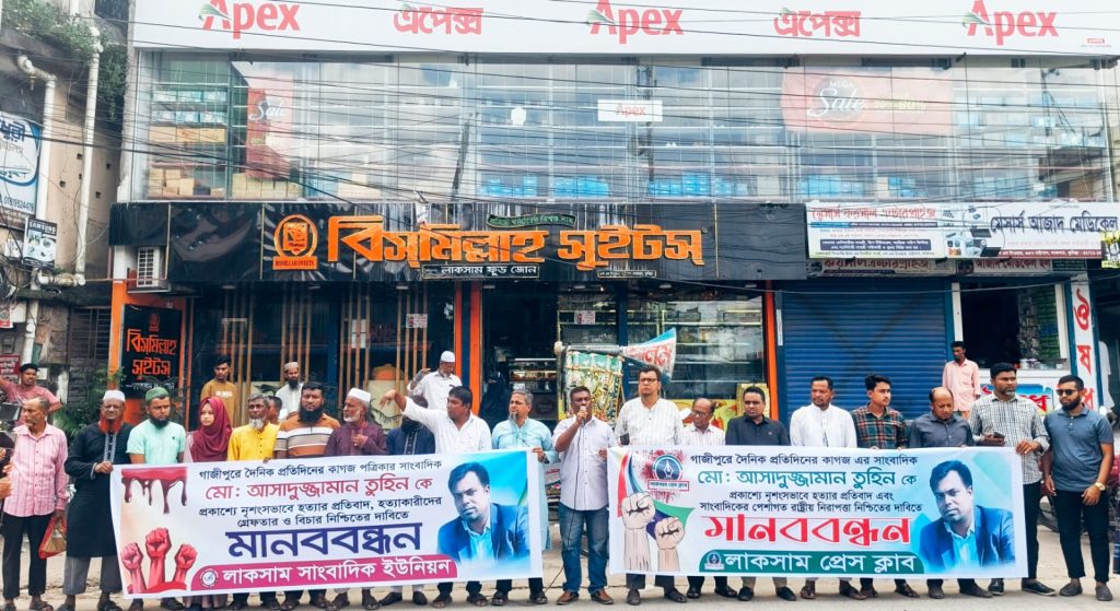 গাজীপুরে দৈনিক প্রতিদিনের কাগজ পত্রিকার স্টাফ রিপোর্টার সাংবাদিক মোঃ আসাদুজ্জামান তুহিনকে নৃশংসভাবে হত্যার প্রতিবাদে হত্যাকারীদের দৃষ্টান্তমূলক শাস্তির দাবিতে লাকসামে মানববন্ধন অনুষ্ঠিত হয়েছে।