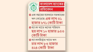গতকাল বৃহস্পতিবার বাংলাদেশ ব্যাংক প্রকাশিত এক প্রতিবেদনে এ তথ্য পাওয়া গেছে। প্রতিবেদনে ব্যাংক ও ব্যাংকবহির্ভূত খাত থেকে সরকারের নেওয়া অভ্যন্তরীণ ঋণের তথ্য তুলে ধরা হয়