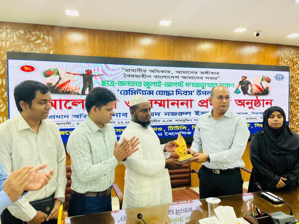 ‘রেমিট্যান্স যোদ্ধা দিবস’ উপলক্ষে সিরাজগঞ্জে সম্মাননা অনুষ্ঠান সিরাজগঞ্জে ‘রেমিট্যান্স যোদ্ধা দিবস’ উদযাপন ও প্রবাসী কর্মীদের সম্মাননা প্রদান।