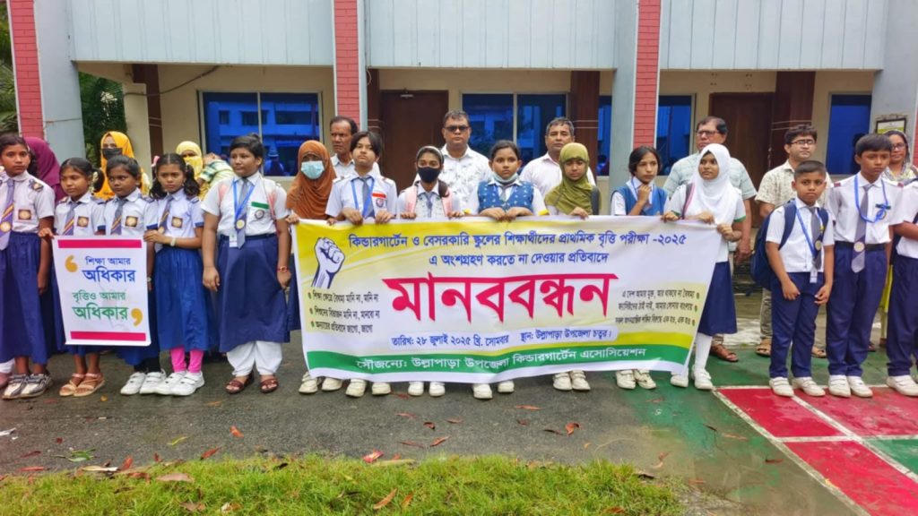 ২০২৫ সালের প্রাথমিক বৃত্তি পরীক্ষায় কিন্ডারগার্টেন ও বেসরকারি স্কুলের শিক্ষার্থীদের অংশগ্রহণ করতে না দেওয়ার সিদ্ধান্তের প্রতিবাদে সিরাজগঞ্জের উল্লাপাড়ায় মানববন্ধন করেছেন অভিভাবক, শিক্ষক ও শিক্ষার্থীরা।